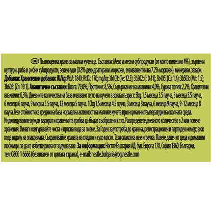 Състав: Месо и месни субпродукти (от които пиле 4%), зърнени храни, риба и рибни субпродукти, минерали, зеленчуци (0,7% дехидратирани моркови, еквивалент на 6% моркови), захари.Добавки: