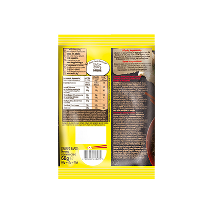 Съставки: Изделие от пшенично брашно 91.7%. Съставки: пшенично брашно, палмово масло, пшеничен глутен, сол, чесън на прах 0.1%, регулатор на киселиността (калиев карбонат), стабилизатор (натриев полифосфат), куркума на прах. Суха смес за овкусяване 7% Съставки: сол, подобрители на вкуса (мононатриев глутамат, динатриев гуанилат, динатриев инозинат), захар, изсушени зеленчуци 4.8% (морков 2.2%, чесън 1.3%, зелен лук, целина, магданоз, копър 0.02%), ароматизанти (телешко), подправки 1.3% (джинджифил на прах 0.6%, черен пипер млян, куркума, дафинов лист 0.04%, канела0.04% семена копър на прах 0.03%, кимион на прах), картофено нишесте, оцветител( амония карамел), соев протеин хидролизат, растително масло (слънчогледово ). Олио за овкусяване 1.3%. Съставки: слънчогледово масло, .