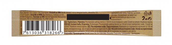 Начин на приготвяне: Съдържанието на едно пакетче NESCAFÉ® GOLD 2g (2g) добави 150 ml топла, но не вряла вода. При желание може да се добави мляко или захар.