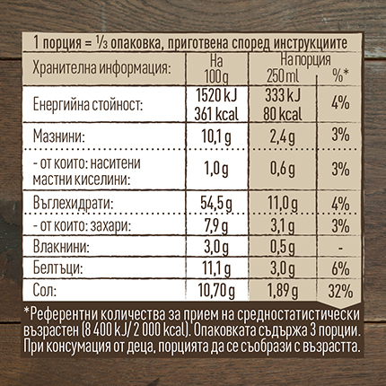 Съставки: пшеничено брашно, царевично нишесте, сол 10,3%, суроватка на прах, слънчогледово масло, соево брашно, екстракти от мая, изсушени гъби 2%