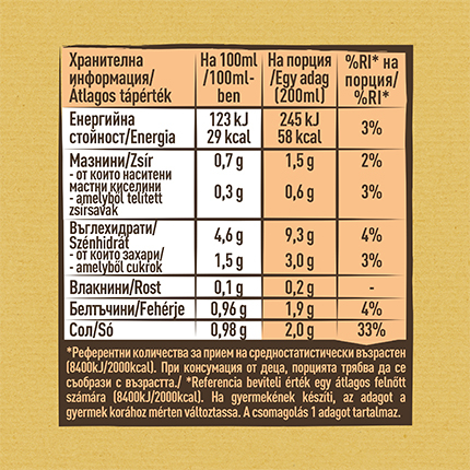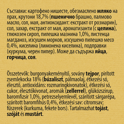 Съставки: картофено нишесте, обезмаслено мляко на прах, крутони 18,7% (пшенично брашно, палмово масло, сол, мая, антиоксидант: екстракт от розмарин),