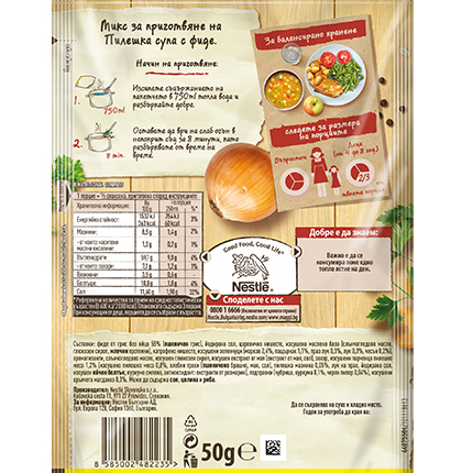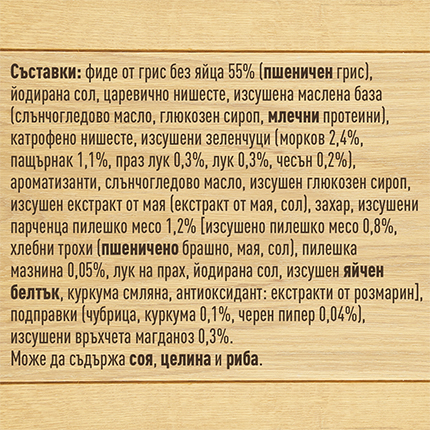 Съставки:фиде от грис без яйца 55% (пшеничен грис),йодирана сол,царевично нишесте,изсушена маслена база (слънчогледово масло, глюкозен сироп, млечни протеини),катрофено нишесте,изсушени зеленчуци (морков 2,4%, пащърнак 1,1%, праз лук 0,3%, лук 0,3%, чесън 0,2%),ароматизанти, слънчогледово масло, изсушен глюкозен сироп, изсушен екстракт от мая (екстракт от мая, сол),захар,изсушени парченца пилешко месо 1,2% [изсушено пилешко месо 0,8%, хлебни трохи (пшеничено брашно, мая, сол), пилешка мазнина 0,05%, лук на прах, йодирана сол, изсушен яйчен белтък, куркума смляна, антиоксидант: екстракти от розмарин],подправки (чубрица, куркума 0,1%, черен пипер 0,04%),изсушени връхчета магданоз 0,3%.