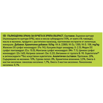 * еквивалентно на 16% рехидратирано месо и месни субпродукти, с мин. 4% говеждо месо.